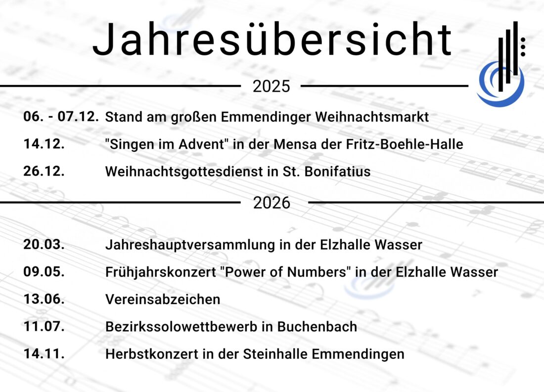 Zum Jahresende können Sie gerne unseren Stand am Weihnachtsmarkt mit Plätzchen, Linzertorten, Notendekorationen und Schoki besuchen kommen. Auch begleiten wir traditionell den Weihnachtsgottesdienst am 26.12. in der St. Bonifatius-Kirche in Emmendingen.