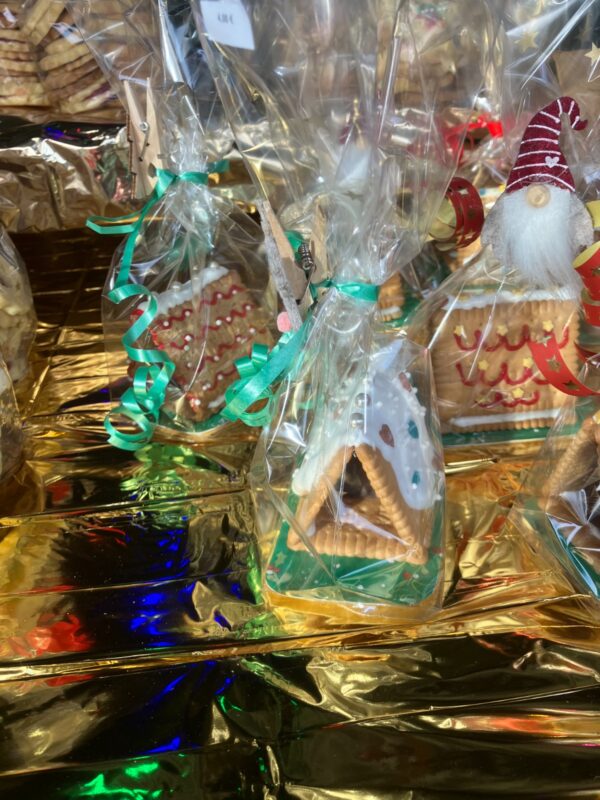 Natürlich war auch das 1. AOE mit einem Stand am Wochenende vertreten. Unsere Schülerinnen und Schüler hatten sich eine Woche vorher getroffen und sehr große Mengen an Hilda- und Butterplätzchen gebacken. Neben zahlreichen anderen Plätzchensorten konnte man bei uns am Stand auch Linzertorten, Notensterne und Notenengel, sowie zum Aufwärmen ein heißes Schoki erwerben.